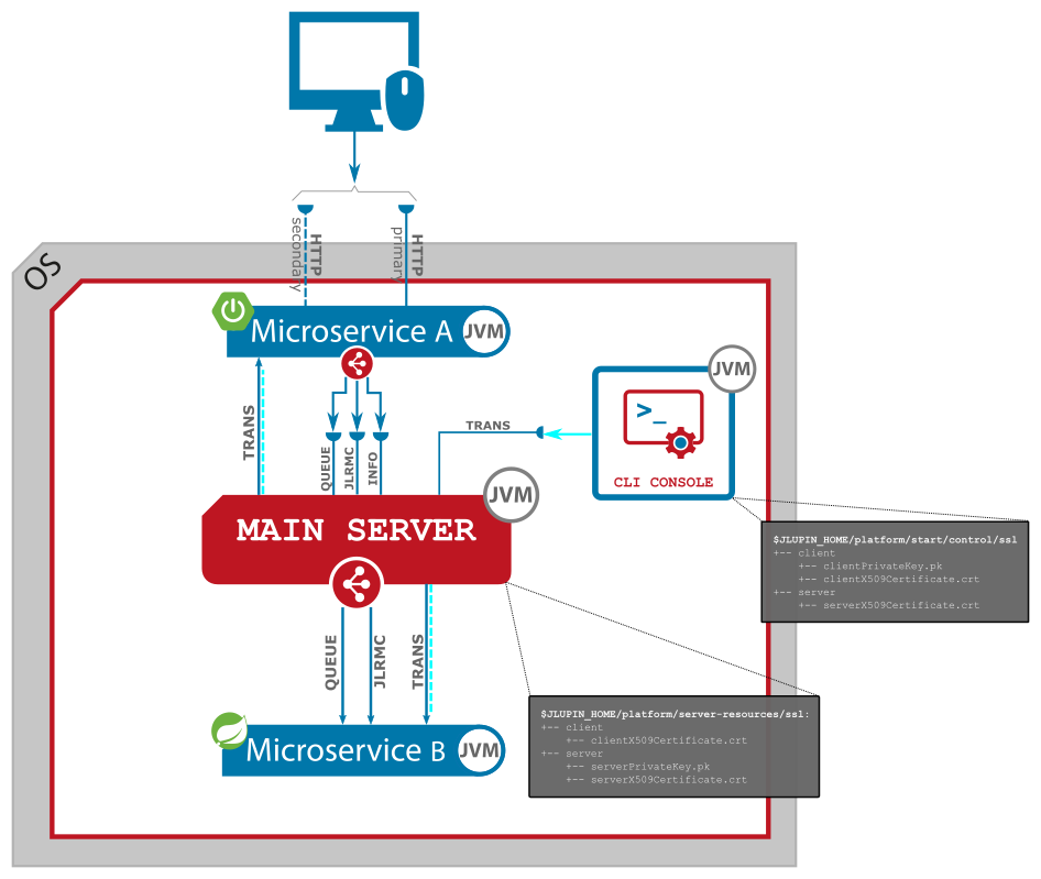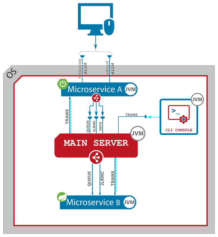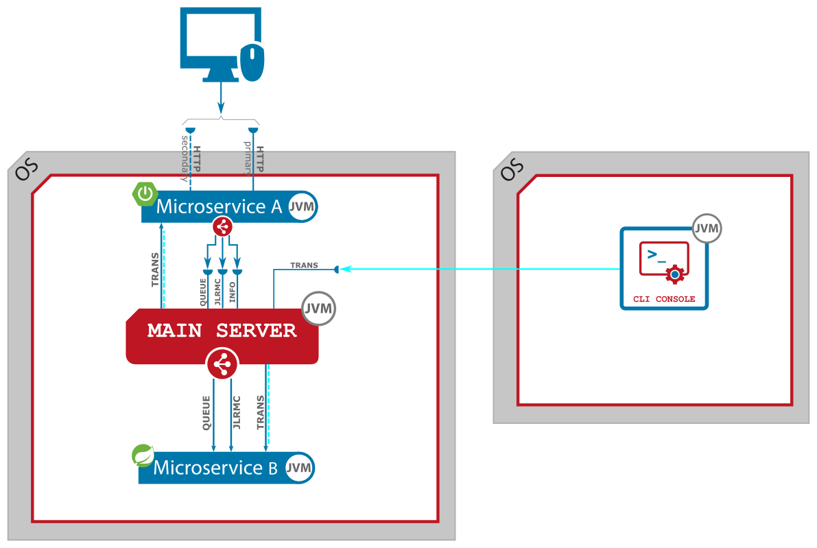 JLupin CLI Console invokes services available on TRANSMISSION port, which are translates by Main Server into atomic actions performed on components of the platform or microservices. This model of integration is common for all management tools provided by JLupin.