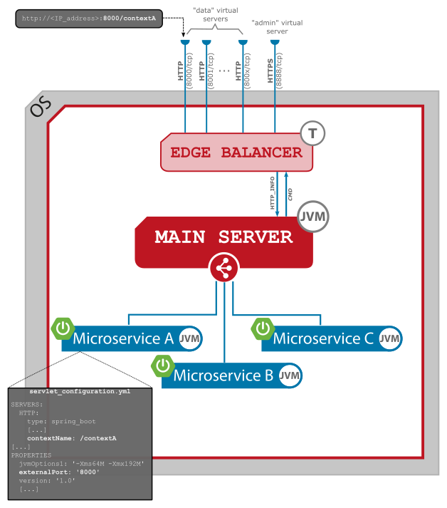 - on 'data' virtual servers (interfaces) only user's servlet microservices are provided and the scope of informational entry points are limited to this particular virtual server.