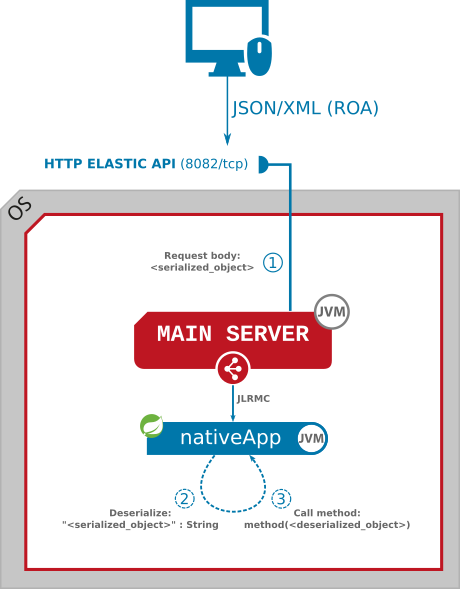Your request is send to Main Server (1). It takes it and extracts body and devides it into seperate String objects. Each array argument becomes one String. Then through JLRMC (binary communication) your serialized objects as a Strings are send to your microservice. Where deserialization is taking place (2). Appropirate serializer/deserializer is used based on choosen sequence (can be set with appropriate header in request). When objects are deserialized, method is called (3) and as an arguments deserialized objects are passed.