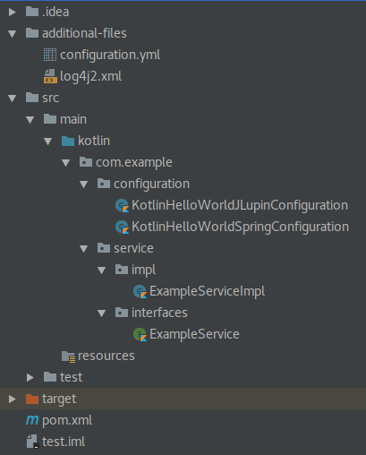 Add two files with configuration: one for JLupin (KotlinHelloWorldJLupinConfiguration) and one for Spring container (KotlinHelloWorldSpringConfiguration). Create package com.example.configuration and put classed there.
