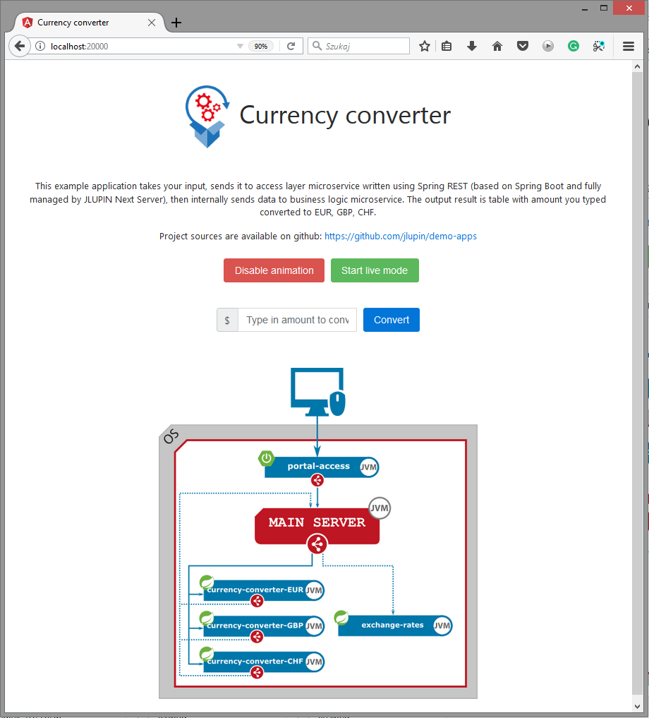 If you go through this quickstart with Community Edition you can get to the example application in microservice architecture. Enter this URL to your browser: