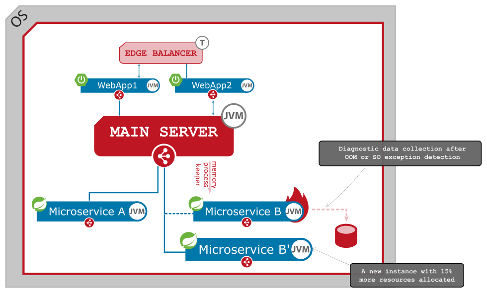 If one of these exception is detected Memory Process Keeper starts a new instance of microservice with 15% (by default) more resources for JVM while from the previous instance diagnostic data is gathered and archived (heap dump, class in which the exception occurred, a log from new instance startup). The point is to keep the service available as long as possible, increase capacity to prevent (or postpone) another occurrence of this incident and collect necessary data to find a root cause.