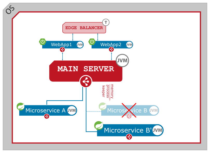 If something (or somebody :)) kills such process or it crushes (there some conditions under which JVM that automatically terminated by itself) Process Keeper detects such incidents end perform start procedure of the microservice immediately.