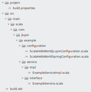 Add two files with configuration: one for JLupin (ScalaHelloWorldJLupinConfiguration) and one for Spring container (ScalaHelloWorldSpringConfiguration). Create package com.example.configuration and put classed there.