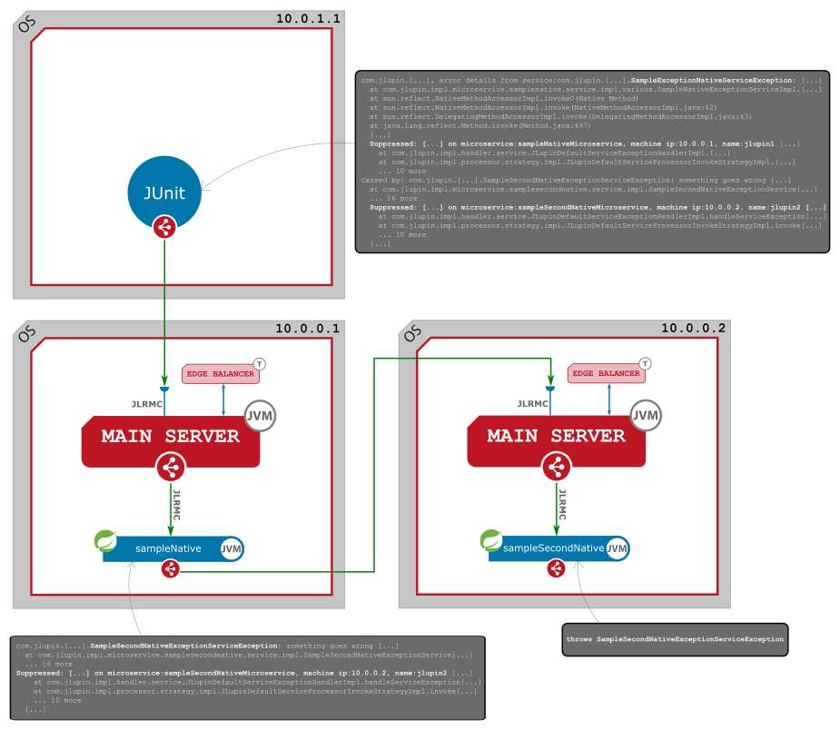 Byte array is correctly send to the client's side (JUnit Client) but during deserialization it turns out that class SampleSecondNativeExceptionServiceException is not available on client's classpath so classes which are calling remote JLupin objects tries to change source exception SampleExceptionNativeServiceException which contains SampleSecondNativeExceptionServiceException to exception of type RuntimeException (JLupinCommandException). It will contains all relevant information - let's see how JLupin joined all stack trace's from all microservices which were involved in communication and created remote stack trace with information about local problem with deserialization: