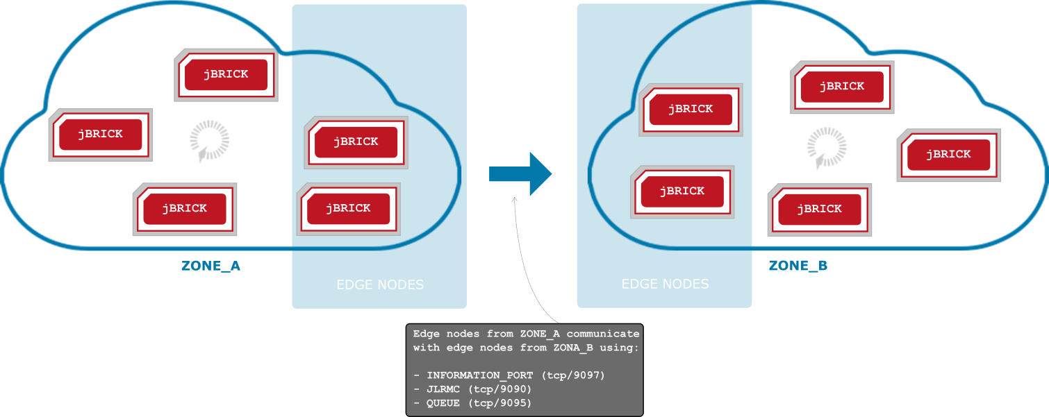 Using JLupin Control Center you can configure the connectivity between zones. If zone zone_A is connected to zone zone_B it means that all nodes belonging to zone_A perform service discovery on all nodes in zone_B and can invoke any service that is available in zone_B. This relation is directed which means that connection from zone_A to zone_B DOES NOT imply invers relation - from zone_B to zone_A. The communication between zones are performed using INFORMATION PORT (tcp/9097) for periodic service discovery and JLRMC (9090/tcp) and QUEUE (9095/tcp) for service synchronous and asynchronous (respectively) invocation.