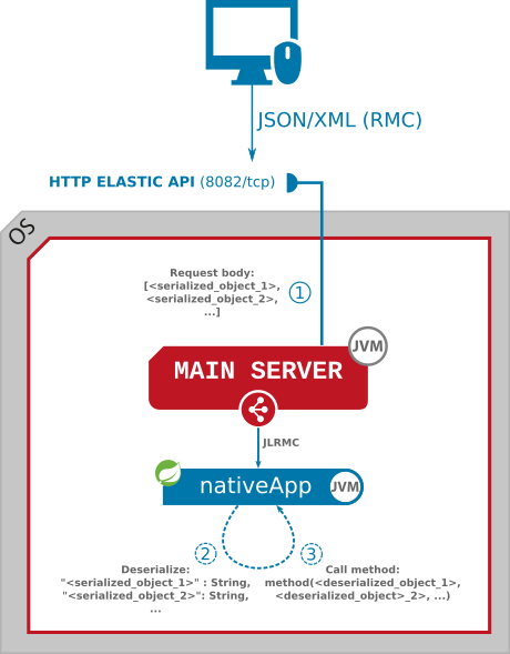 Your request is send to Main Server (1). It takes it and extracts body and divides it into separate String objects. Each array argument becomes one String. Then through JLRMC (binary communication) your serialized objects as a Strings are send to your microservice. Where deserialization is taking place (2). Appropriate serializer/deserializer is used based on chosen sequence (can be set with appropriate header in request). When objects are deserialized, method is called (3) and as an arguments deserialized objects are passed.