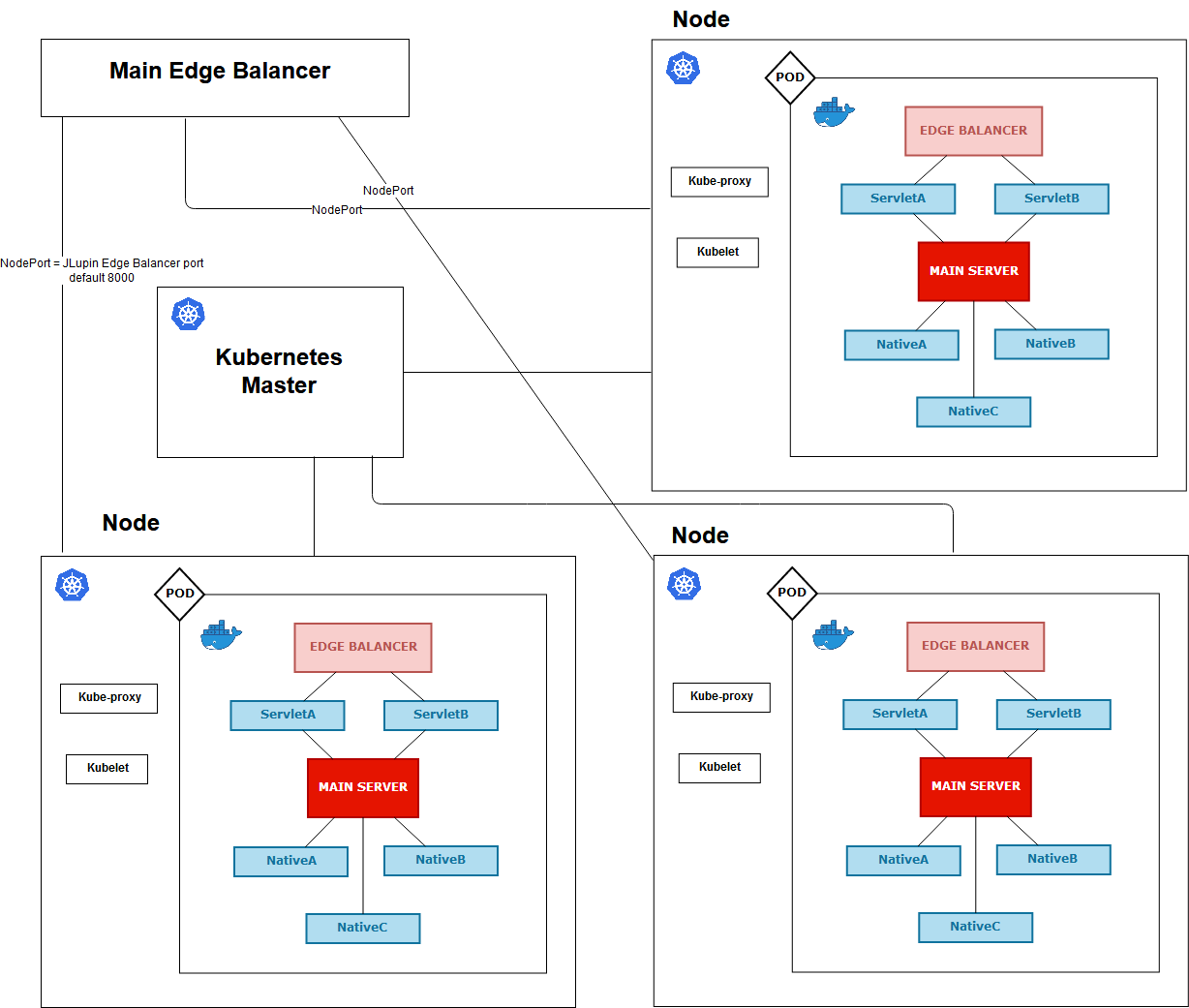 This configuration is using symetric PODs (all PODs are deployed with same microservices). Main servers running on PODs are not connecting witch each other. Traffic is load balanced to PODs .