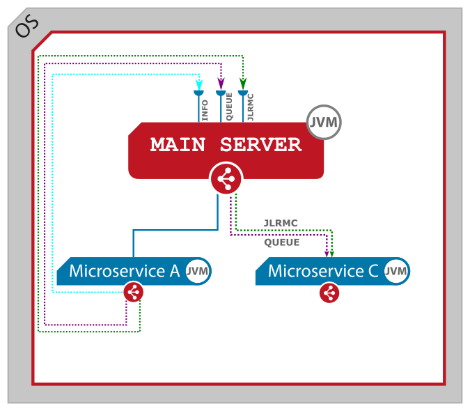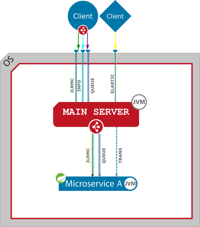 A client communicates with a native microservice through Main Server, which provides its services on three interface automatically (JLRMC, QUEUE, ELASTIC).