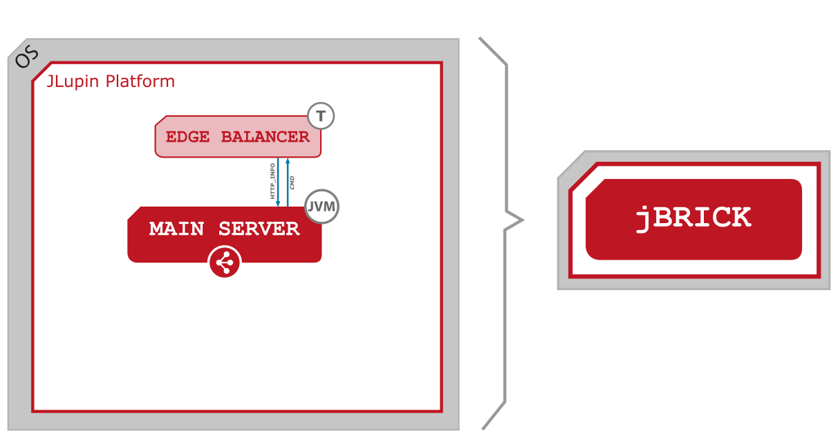 The basic element of the JLupin architecture is jBrick (JLupin Brick), which is a separate resource space (physical server, virtual server or container) with JLupin Platform components installed and running. There two main components of JLupin Platform, which are responsible for all tasks in the microservices environment, from basic management to advanced traffic engineering: