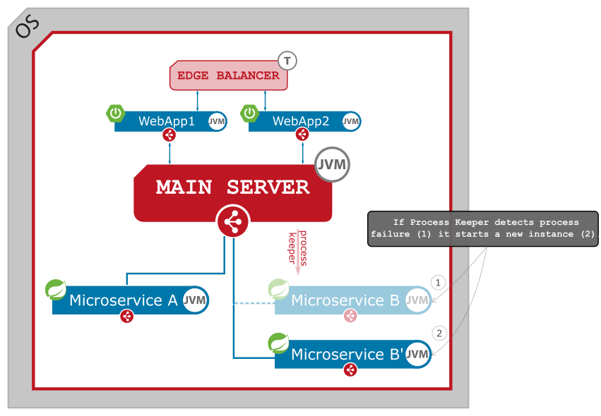 If something (or somebody :)) kills such process or it crushes (there some conditions under which JVM that automatically terminated by itself) Process Keeper detects such incidents end perform start procedure of the microservice immediately.