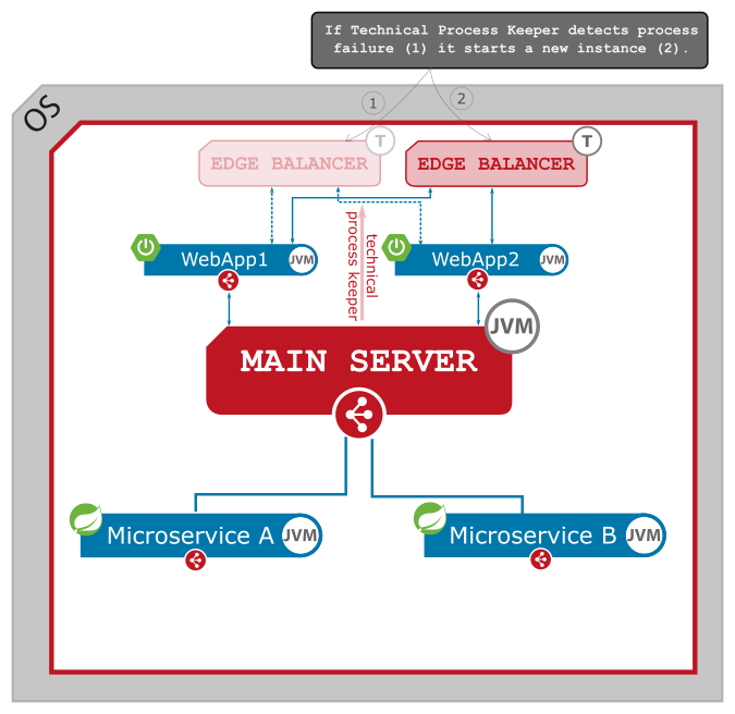 Technical Process Keeper is a part of Process Manager (running inside Main Server) that monitors the existence of technical microserices' process on OS level. In JLupin Platform 1.5 we've introduced one technical microservice - Edge Balnacer (nginx), which is very critical from service accessibility point of view.