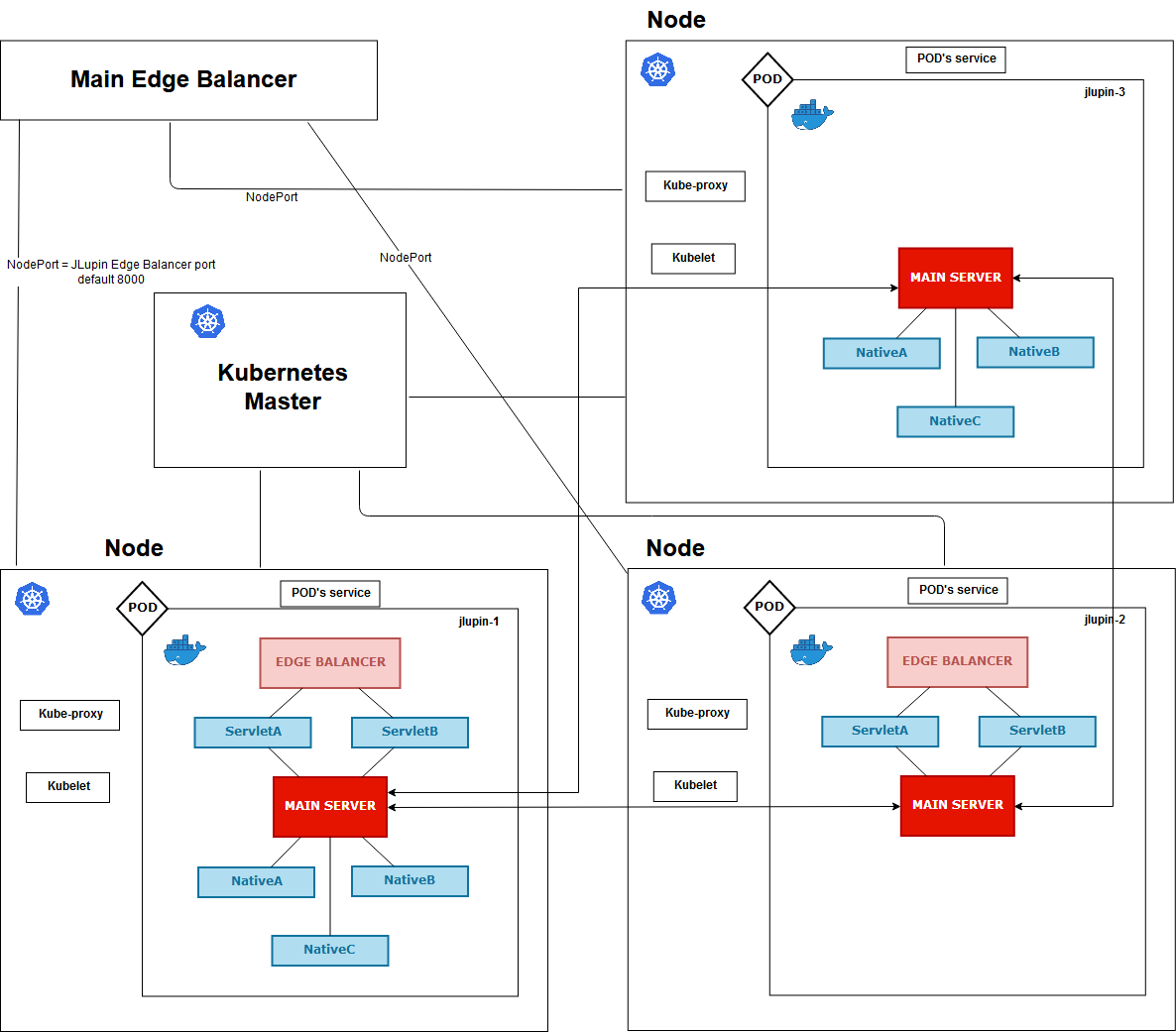 Prepare docker images with your environment configuration. To do so you can use base images provided by JLupin. You only need to add your microservices (you can create multiple images with asymetric configuration). You should also change main server configuration file (main.yml) and fill node peers with names you will use to create services for PODs. For service created with hostname set to foo and subdomain set to bar DNS address for accessing it should be foo.bar.my-namespace.svc.cluster.local. The best option is to create dockerfile with rules for creating image. To do so create directory called docker for example. Then inside create directory called microservices and put inside all zip files with your microservices. Also create main-server directory and put there your configured main-server.yml. Finally create Dockerfile file in docker directory and put code from below: