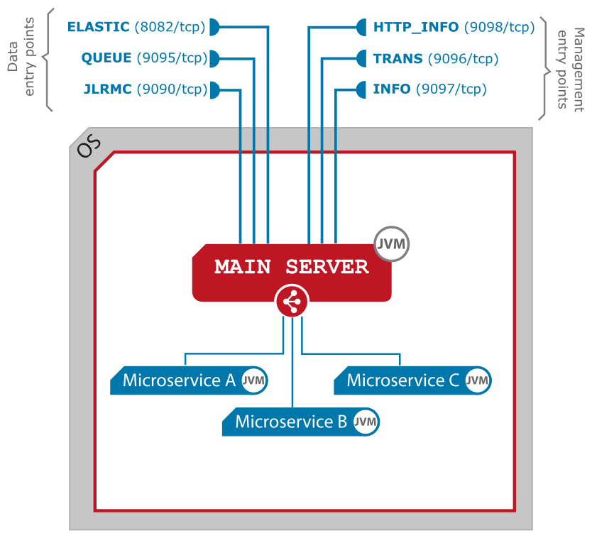 • TRANSMISSION_BINARY - binary entry point for management purposes like changing configuration, managing microservices (start, stop, upload, ...), getting information from the environment etc. It is usually used by management tools like JLupin Control Center. It listens on 9096 port and implements TCP as a transmission layer protocol.