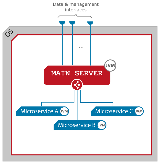 JLupin Main Server runs microserivces on its backend, which means that they share the same resource space (server, virtual server or container) as Main Server.