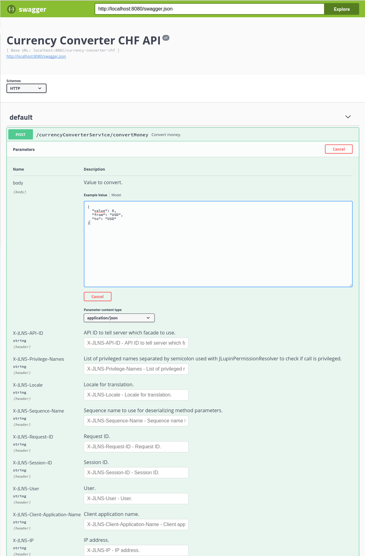 Now generate Swagger API specification file with maven command mvn jlupin-platform:generate-swagger --projects example/implementation. You should see your swagger.json inside example-implementation target directory. Next step is to serve this file through HTTP server wich CORS support enabled. You can do this with our static-files-provider microservice. Just copy swagger.json to static directory inside microservice folder. Your file should be available at http://localhost:8000/jlupin-static-files-provider/swagger.json. Then go to Swagger UI page http://petstore.swagger.io/ and paste your url in top of the page and clock Explore. Your api should be loaded and ready to play with.