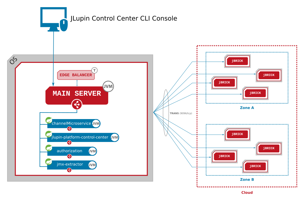 JLupin Control Center communicates with JBricks using transmission entry point configured on servers (by default running on 9096 port). No more communication ports are required.