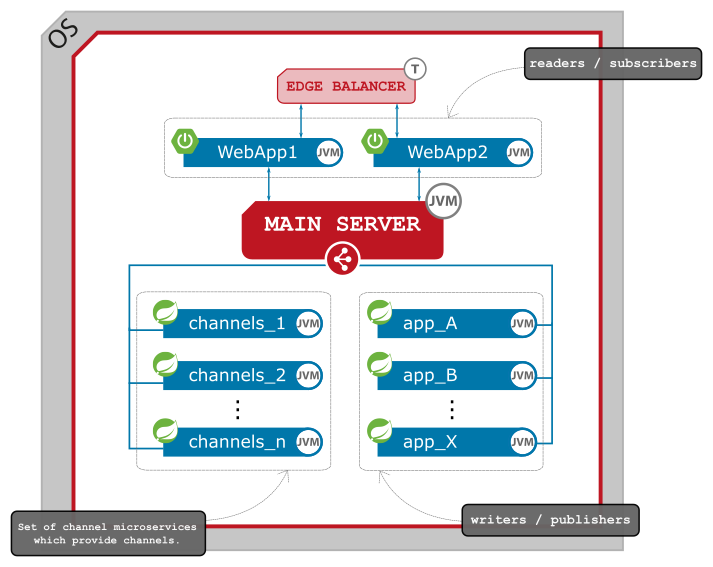 JLupin supports publish & subscribe pattern where many clients (microservices) communicate through a channel. Channels implements classic FIFO algorithm to process messages - a message which is put in the end of the channel by a publisher/writer waits to be taken from the front and deleted by a subscriber/reader.