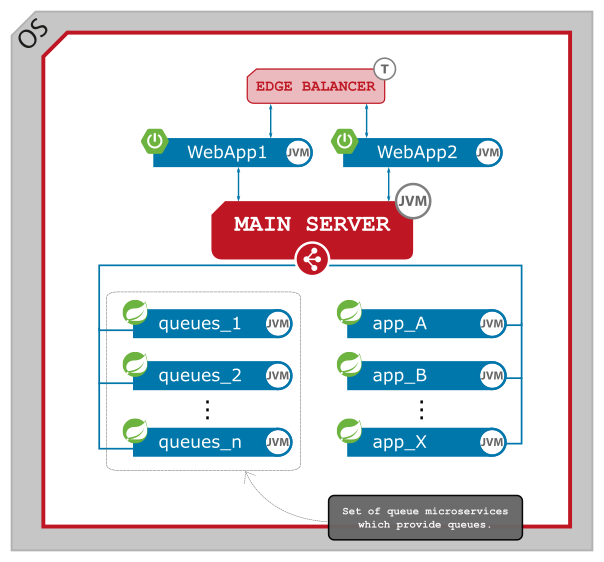 JLupin provides reactive queues with an option of automated retrieving results - of course in microservice architecture. Queues are defined on specific native microservices (queue microservices). The number of queues defined on the particular queue microservice as well as the number of queue microservices depends of your needs, processing characteristic, security rules and infrastructure resources. In that way you can build the queue subsystem in microservice architecture, where queues are separated by running its own JVMs. This way your queues will be more resistant to failures, outages, overloads, etc.