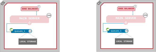 Queues with persistance to disk can be configured for only local communication. If so there is no need to configure shared storage for them. But there is a need to configure balancers for platform and queue protocol to communication only with scope of localhost.