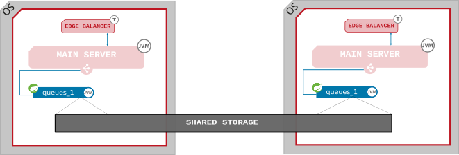 Queues with persistance to disk can be configured as global queues. If so you must configure shared storage for them. Load balancers should be configured for all nodes communication - so they should use priority or round robin algorithms.